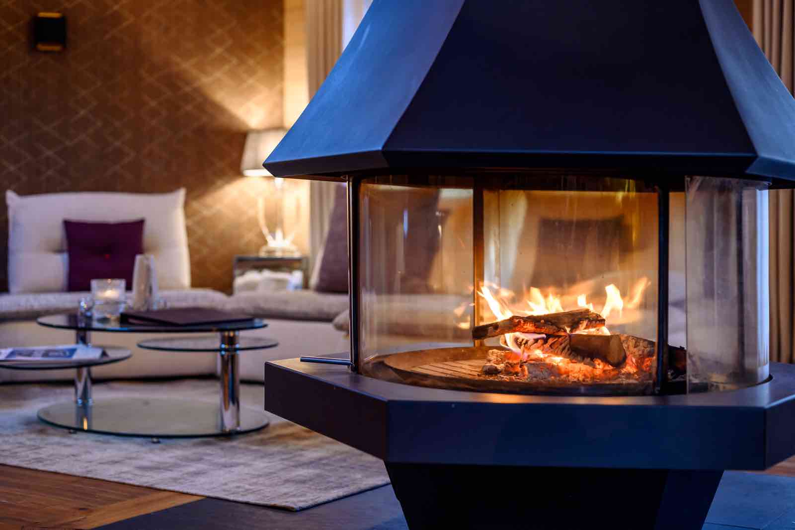 A large living-room with a central fireplace, TV and balcony.